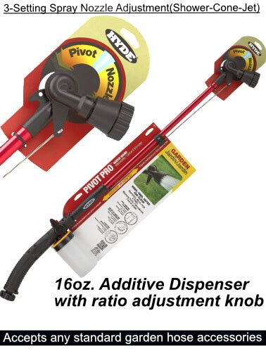 Attach a HYDE® PivotPro™ directly to your garden hose and you have a fast, easy solution to all kinds of lawn and garden jobs. Watering plants? Open the nozzle to fine mist, then switch to a jet stream for cleaning muddy boots or equipment. Feeding the lawn? Just fill the mix dispenser with fertilizer concentrate, select a feed-to-water ratio and go! The mix dispenser can be removed for thorough washing, so you can use the same PivotPro™ with any additive for weeding, feeding, watering and cleaning.